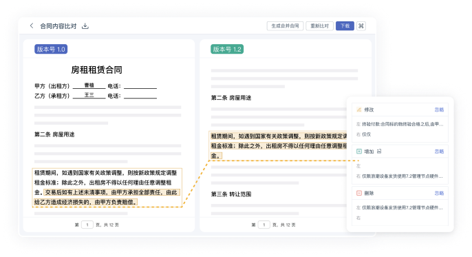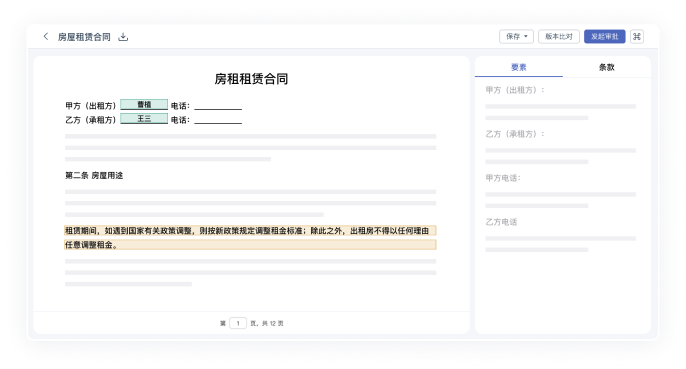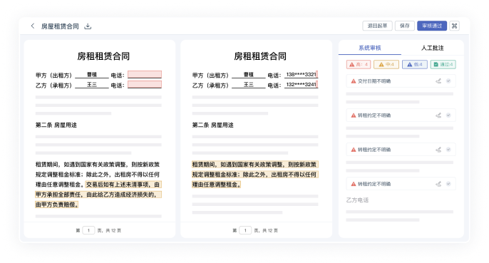 智能審查合同風(fēng)險(xiǎn),人工可快速定位復(fù)核。