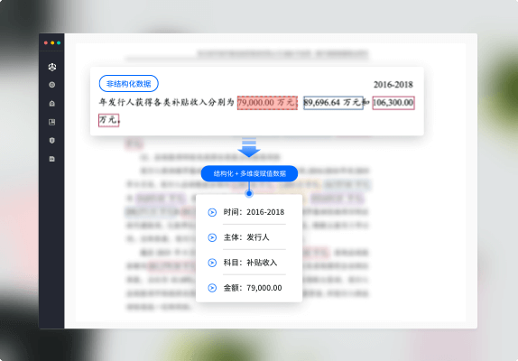 918博天娱乐官网財務(wù)報表解析與核查系統(tǒng),整合行業(yè)領(lǐng)先的智能文本解析技術(shù)與豐富的金融行業(yè)項目經(jīng)驗,融合了大量業(yè)務(wù)專家專業(yè)知識及職業(yè)判斷。相較于同類產(chǎn)品,財務(wù)邏輯更準(zhǔn)確,數(shù)據(jù)的識別與填列更加精準(zhǔn)...
