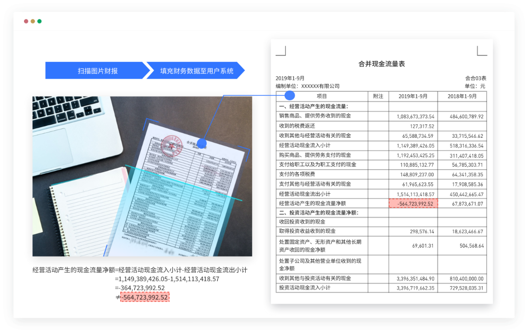 內(nèi)嵌財務(wù)邏輯校驗公式,支持對所有上傳的財報內(nèi)容進行試算平衡校驗,以減少由文檔質(zhì)量造成的識別誤差影響